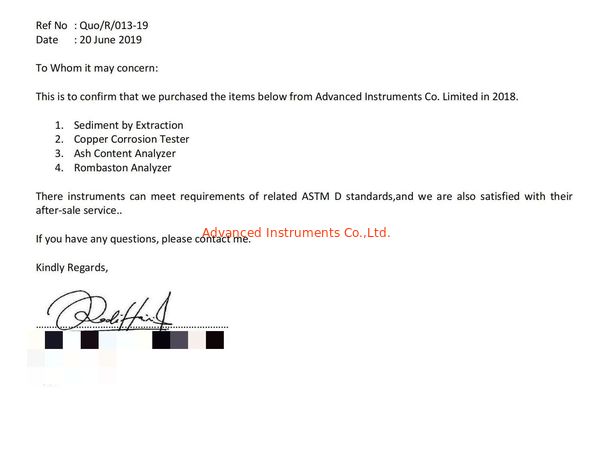 Стандарт:Performance Letter Область / Диапазон:Oil Test Kits Выпущен К:Malaysia Customer |