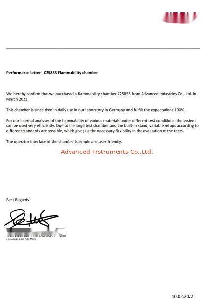 Стандарт:Performance Letter Область / Диапазон:FAR 25853 flammability tester Выпущен К:Germany customer |